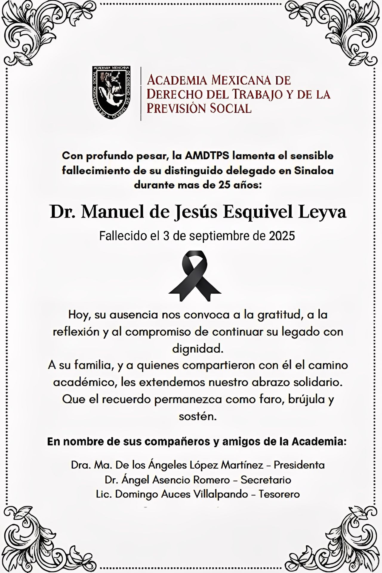 El Dr. Manuel de Jesús Esquivel Leyva fue profesor e investigador en la Facultad de Derecho de la Universidad Autónoma de Sinaloa, donde su labor docente y editorial dejó una huella profunda.